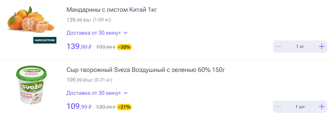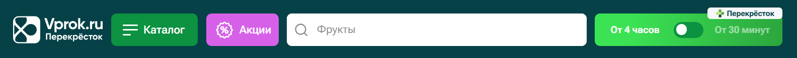 - Если ваш адрес входит в зону Доставки от 30 минут, вы увидите возможность выбора между двумя типами доставки уже на главном экране мобильного приложения или сайта. Переключитесь на Доставку от 30 минут и выбирайте из представленного ассортимента необходимые вам продукты и товары. Оформление заказа происходит в Корзине. Более подробную информацию вы найдете в этом разделе.