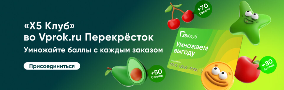 «X5 Клуб» — это программа лояльности, которая объединяет магазины «Пятёрочка», «Перекрёсток», онлайн-гипермаркет «Vprok.ru Перекрёсток», экспресс-доставки из этих торговых сетей, а также сервис доставки роллов и суши «Много Лосося». Получайте до 1,5% кешбэка с покупок в онлайн-гипермаркете «Vprok.ru Перекрёсток» на вашу карту «Х5 Клуба» и оплачивайте баллами до 30% от стоимости заказа.