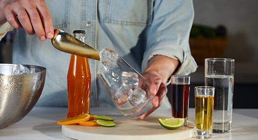 Перемешайте и украсьте коктейль слайсами лайма и апельсина.