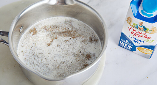 В кастрюле растопите на среднем огне сливочное масло «Домик в деревне», всыпьте муку и жарьте, помешивая, 2 минуты.