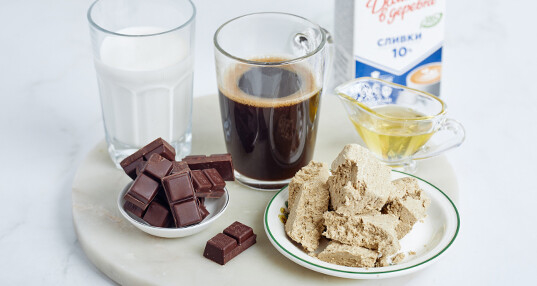 Сварите кофе своим любимым способом. Пробейте блендером 150 мл сливок «Домик в деревне» 10%, халву и шоколад до однородной массы.