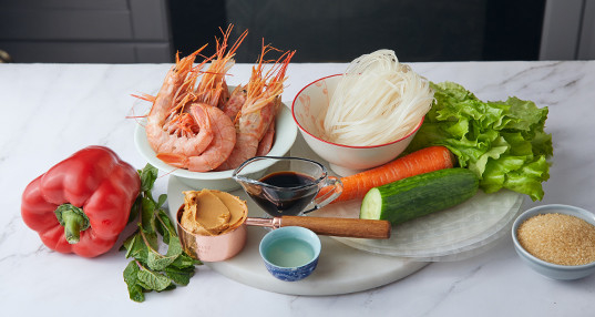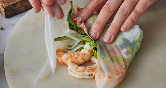 Налейте теплую воду в широкое блюдо, чтобы поместилась рисовая бумага. Опустите рисовый лист в воду на несколько секунд, положите на смоченную водой доску. Разложите овощи и креветки, как на фотографии.