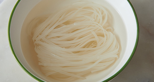 Залейте рисовую лапшу кипятком и оставьте на 5-8 минут (на всякий случай проверьте время приготовления на упаковке). Затем слейте горячую воду и промойте лапшу под проточной холодной водой.
