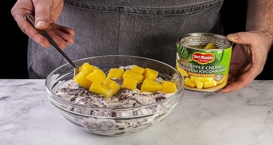 Выложите сверху корж и пропитайте его соком ананаса Del Monte. Накройте торт пленкой и уберите на несколько часов в холодильник.