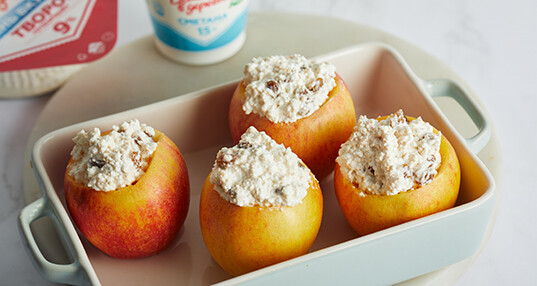 У яблок удалите сердцевину, не прорезая до конца. Смешайте творог и сметану «Домик в деревне» с изюмом, корицей и медом.